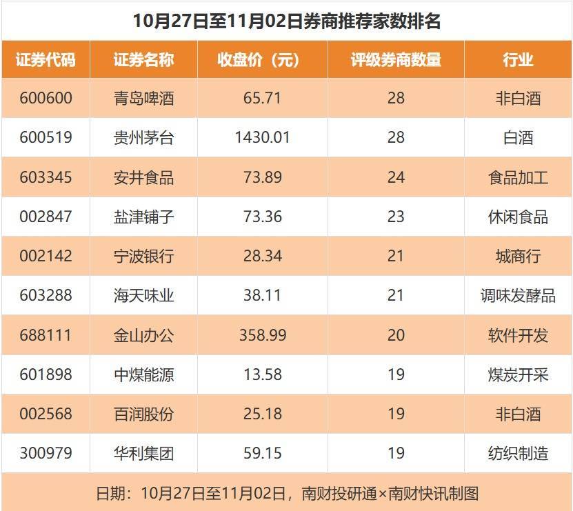 从券商推荐家数来看,10月27日至11月2日有1609家上市公司得到券商推荐,其中青岛啤酒获得28家推荐,贵州茅台获得28家推荐,安井食品获得24家推荐。
