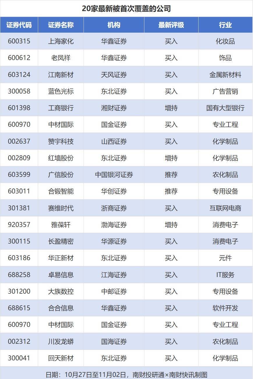 首次覆盖方面,10月27日至11月2日券商共给出了98次首次覆盖,其中上海家化、老凤祥获得华鑫证券分别给予“买入”“买入”评级,江南新材获得天风证券给予“买入”评级,蓝色光标获得东北证券给予“买入”评级,工商银行获得湘财证券给予“增持”评级。