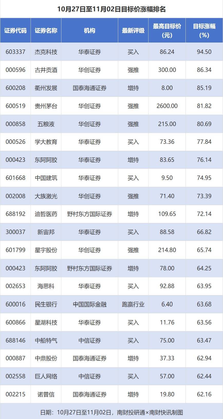 南财投研通数据显示,10月27日至11月2日,券商给予上市公司目标价共1532次,按最新收盘价计算,目标价涨幅排名居前的公司有杰克科技、古井贡酒、衢州发展,目标价涨幅分别为94.50%、86.34%、85.19%,分别属于专用设备、白酒、房地产开发行业。