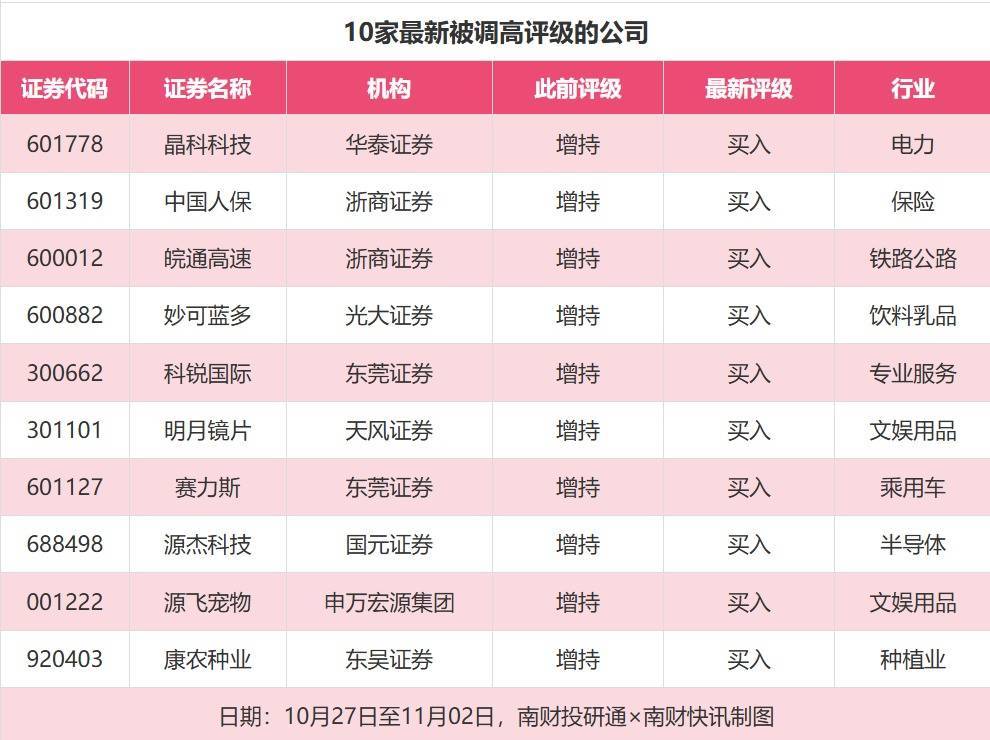 评级调高方面,10月27日至11月2日,券商调高上市公司评级达到24家次,最新数据包括了华泰证券对晶科科技的评级从“增持”调高至“买入”,浙商证券对中国人保的评级从“增持”调高至“买入”,浙商证券对皖通高速的评级从“增持”调高至“买入”。