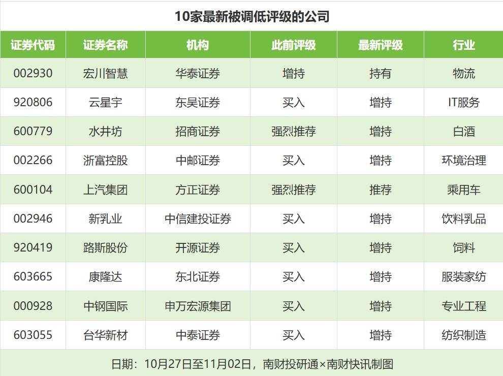 评级调低方面,10月27日至11月2日,券商调低上市公司评级达到40家次,最新数据包括了华泰证券对宏川智慧的评级从“增持”调低至“持有”,东吴证券对云星宇的评级从“买入”调低至“增持”,招商证券对水井坊的评级从“强烈推荐”调低至“增持”。