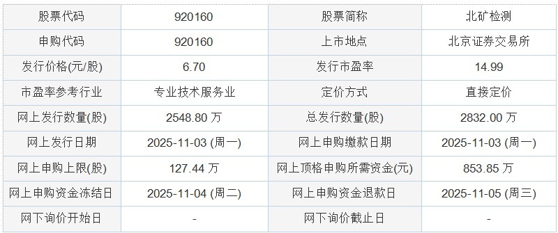 北矿检测2025年10月30日披露的向不特定合格投资者公开发行股票并在北京证券交易所上市发行公告 显示,若本次发行成功,预计公司募集资金总额18,974.40万元,扣除预计发行费用1,726.90万元(不含增值税)后,预计募集资金净额为17,247.50万元。