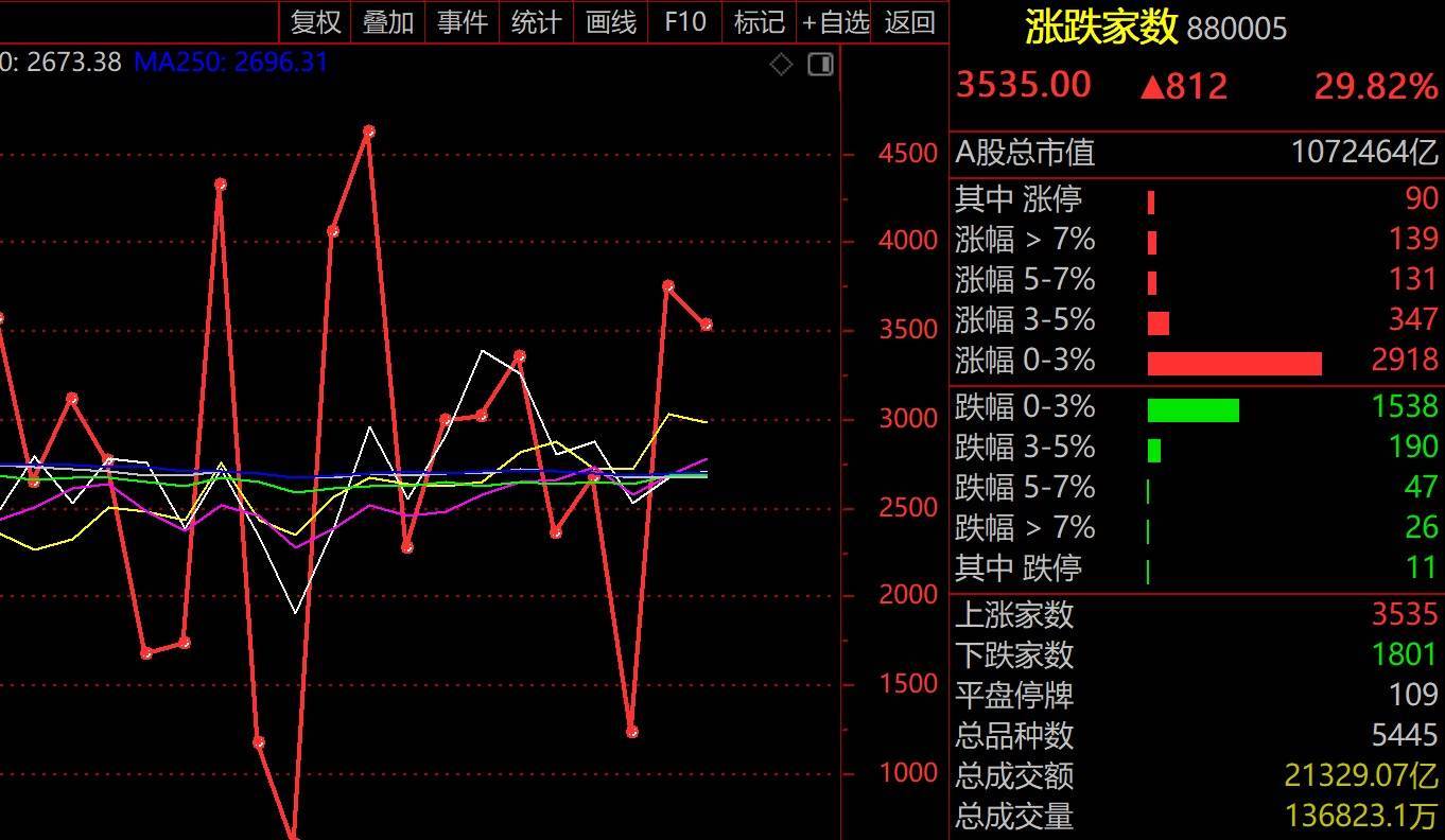 整个市场,3535股上涨,1801股下跌,109股平收。总成交额2.13万亿元,较前一交易日缩量约2169亿元。